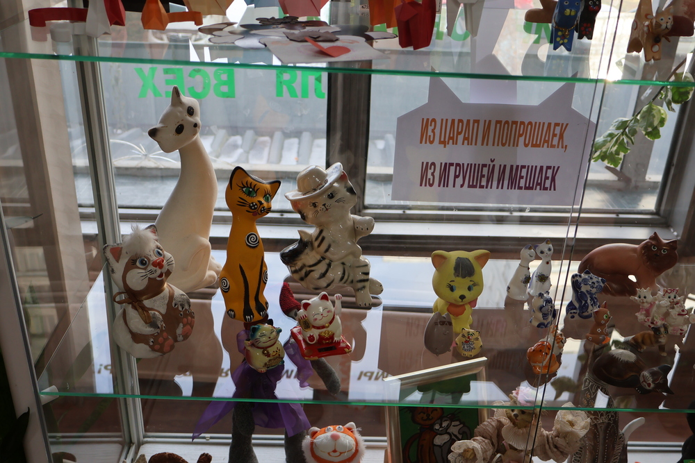 Весь день в библиотеке работали тематические выставки, где можно было познакомиться с книгами о котах, рассмотреть веселые и яркие картины, а также многочисленные разнообразные фигурки котов и кошек.
